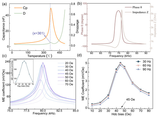 Figure 3a. The properties of the selected PZT begin to change at 361 °C, meeting the experimental requirements. Based on the fabrication method of the ME composite mentioned above, the selected PZT coupled with the magnetostrictive phase, and the properties of the ME composite were tested. The ME coefficient is an important indicator for evaluating the ME conversion ability of the ME composite. To facilitate measurement and comparison, we selected the ME voltage coefficient (