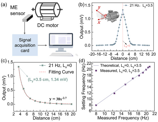 Figure 4a. The DC motor has significant advantages over other types of motors in terms of stability. Its speed and output characteristics can be precisely adjusted by controlling the voltage or current, ensuring high stability during long-term operation. Due to its relatively simple structure and low noise level, the DC motor helps minimize interference with the test signals, further improving the accuracy and stability of the measurement results. Therefore, we chose the DC motor for our experiments to ensure the reliability and precision of the test results. The ME tachometer was placed next to the DC motor in the correct orientation. When the motor ran, it drove a pair of permanent magnets. The ME tachometer sensed the AC magnetic field signal and generated an electrical signal. The signal acquisition card received this electrical signal and transmitted it to the upper computer software for subsequent processing. FFT was applied to the upper computer to analyze the collected data. To define the spatial coordinate system, the following reference was established: the center of the permanent magnet was defined as the origin (0, 0); the direction along the shaft of DC motor was taken as the
