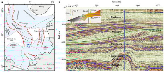 Geology setting of the F3 block. (a) Structural setting of the North Sea basin. The location of the F3 block is highlighted by a blue rectangle. (b) Seismic section of the F3 block (Inline 362). The geological periods of strata are annotated. The green line is the Truncation horizon. The inset is the Truncation horizon in 3D, with the four wells and the prograding direction annotated. The red line serves as the intersection between the horizon and the seismic section.