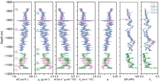 Figure 2 gives a comprehensive overview of the seven logs corresponding to the four distinct wells. For each well, a specific interval ranging from FS2 to FS6 is selected and presented. In comparison to F03-2 and F03-4, the depths recorded for F02-1 and F06-1 are notably deeper and shorter. This difference is due to their geographic position, which lies in the southwestern periphery of the survey area, precisely at the foreland of the prograding delta, as depicted in Figure 1.