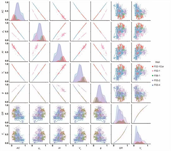 Crossplot of the seven logs of the four wells and F02-1Cor. From left to right, AC, ρb, AI, Vp, ϕ, GR and Vc.