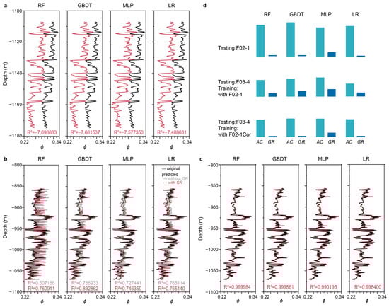 After the correction of density logs, however, the prediction accuracy for all four ML algorithms experienced a substantial surge, achieving exceptionally high levels of accuracy, with R2 values approaching 1 for each algorithm. This trend was observed when F03-4 served as the testing well, and the corrected F02-1 was incorporated into the training dataset, as shown in Figure 5c. It is crucial to emphasize that the achieved optimal performance hinges critically on the establishment of the ideal dataset setting, where the porosity data is systematically derived from the measured acoustic data through the application of a distinct and carefully calibrated formula. This underscores the paramount importance of a rigorous and systematic approach to data processing and model training, which is essential for attaining predictions of both high fidelity and precision.