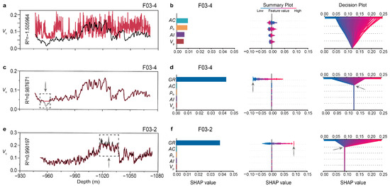 To interpret the sections of the Vc logs that exhibited unpredictable patterns at a depth of approximately −960 m, a review of the training and the testing dataset was undertaken. Specifically, considering the scenario where F03-4 serves as the testing well and the other three wells as the training well, we note that the Vc range for the other three wells ranges from 0.050 to 0.300, whereas the Vc range for F03-4 to be predicted is 0.025 to 0.200. Therefore, the predicted lowest values of Vc for F03-4 exceed the bounds of the training dataset, which is indicative of an Independent and Identically Distributed (IID) issue. Analogously, reversing the roles of the testing and training well also leads to an inaccurate prediction of the higher Vc values in F03-2. The lowest and highest unpredictable Vc values are positioned at the periphery of both the SHAP summary plot and the decision plot, as indicated by the grey arrows in Figure 6c,d, and the yellow arrows in Figure 6e,f.