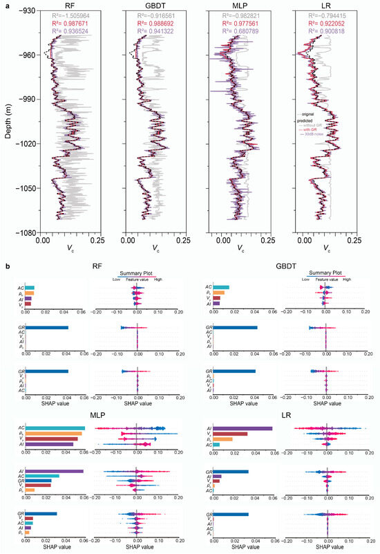 The interpretation of the significance of various features across all four ML algorithms is summarized in Figure 7. Notably, although MLP initially failed to prioritize gamma logs as the primary input feature, it regained its rationality after undergoing a noise-robust training procedure. This can be observed in Figure 7b for MLP, which demonstrates the algorithm’s adaptability. Within this noise-robust training paradigm, the predictions attained satisfactory levels, albeit with a notable decline in MLP’s performance due to a relatively low signal-to-noise ratio (SNR) of 30, as evident in Figure 7a for MLP. The SHAP analysis revealed consistent patterns among all four algorithms, regardless of their varied underlying architectures—whether tree-based, neutron network-driven, or linear regression-oriented. By comparing the SHAP explanations with rock physics principles, we observed a close alignment of the four algorithms with the fundamentals of rock physics, indicating adherence to its cause relationships.