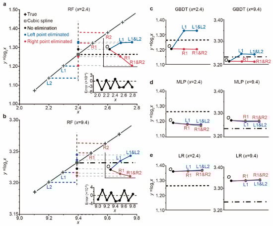 To further elaborate on the intricacies of the IID problem and explain the inability to make accurate predictions, we employed a straightforward binary logarithm function of y = log2x, with the range of x set from 1 to 11. We subjected the prediction of y to a rigorous test using four different ML algorithms, contrasting the results against those obtained from cubic spline interpolation and the ground truth. As shown in Figure 8a at x = 2.4, where the true value of y is denoted by black crosses along the black line, RF predicted y = 1.291, marked by a black dot, exceeding the actual value. From x = 2.0 to 2.8, the predictions either exceeded or fell below the true values, as evident in the lower inset. Notably, as we incrementally removed one or two neighboring labels from the training dataset, the predicted values rose significantly, depicted by blue dots. Conversely, the predicted values decreased progressively when one or two labels to the right were eliminated. A comparison with the ground truth is illustrated in the upper inset. Similar trends were observed for the x range from 9.0 to 9.8, as shown in Figure 8b. The performance of the remaining three algorithms is presented in Figure 8c–e. Despite the remarkable success ML has achieved owing to its numerous advantages, the predictions generated by the four ML algorithms can still trail behind the accuracy of cubic spline interpolation, even with a substantially vast training dataset.