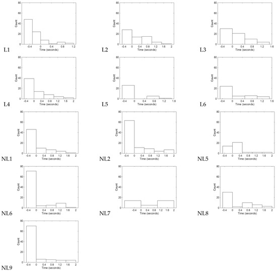 As stated in the Introduction, the aim of the study was to determine if classically-defined learners demonstrated visual anticipation of the outcome for their right leg movements. We first hypothesized that infants classified as classically-defined learners would demonstrate a bias in the onset of their gazes toward the robot’s activation. Thus, the distribution for the onset of an infant’s gaze would be positively skewed, i.e., the onset of the gaze would occur more in the predictive gaze region of the distribution. Qualitatively, the distribution for the onset of gazes on the robot’s activations was plotted using a frequency graph and these plots were visually inspected for skewness [