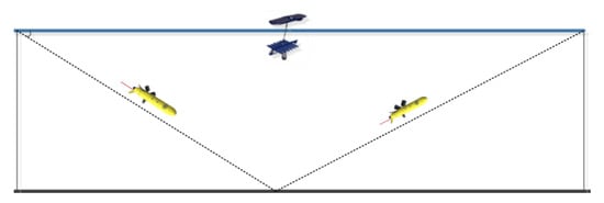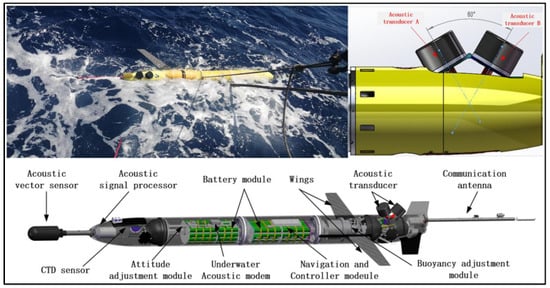 Traditionally, underwater gliders have operated by alternating between floating and diving to collect observational and detection data, periodically surfacing to transmit the data via satellite communication [,]. However, this operational mode compromises the timeliness of marine data collection, potentially resulting in missed opportunities for decision-making and limiting the ability to meet short-term data acquisition demands. To overcome these limitations and improve the efficiency of marine exploration and target detection, increasing attention has been directed toward integrating underwater acoustic (UWA) communication technology into underwater gliders and other submersible vehicles [,,,,,].