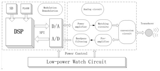 The modulation of received data primarily involves functions such as amplification, filtering, and gain control. The high-efficiency signal transmission module integrates a D-class power amplifier and a matching network, enabling UWA signal transmission with a sound source level exceeding 186 dB. The low-power signal processing module incorporates a low-power watch circuit and a high-speed DSP processor, which are responsible for low-power signal detection and communication positioning algorithms, respectively.