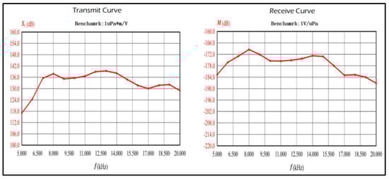 The UWA transducer adopts a ceramic-ring, semi-space, omnidirectional, oil-filled design, offering superior performance compared to porcelain-based energy transducers in terms of directivity, transmitting voltage response, and maximum sound source level. Its operational frequency ranges from 8 kHz to 16 kHz, with a transmitting voltage response exceeding 136 dB, receiving sensitivity surpassing −178 dB, and a maximum emission sound source level of 195 dB. The frequency response characteristics of the UWA transducer are shown in Figure 4.