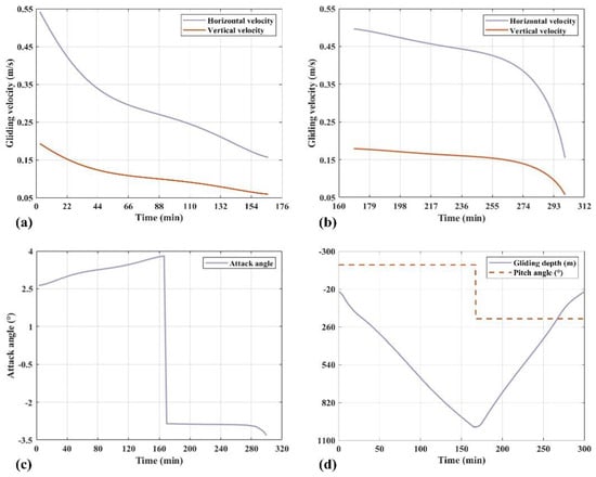 Once the dynamic model has been established, the motion of the glider can be simulated. By inputting motion parameters, numerical simulation and analysis of the motion process are conducted in the MATLAB environment. Figure 7 presents the results of dynamic simulations.