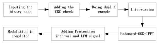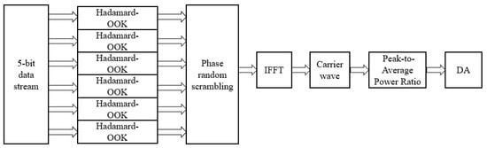 The modulation process utilizes Hadamard codes, which are characterized by an equal number of 0 s and 1 s. This property enhances the coding gain under the same SNR, thereby improving the robustness of the underwater glider’s communication performance. Following channel encoding, the input bitstream is mapped onto multiple subcarriers within a specified bandwidth using inverse fast Fourier transform (IFFT). The modulation process of the Hadamard code is shown in Figure 9.