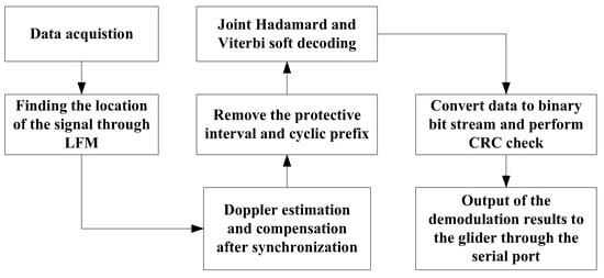 In the communication system of the underwater glider, the signal processing workflow at the receiver plays a critical role, particularly in complex underwater acoustic channel environments. The system must address challenges such as multipath interference and Doppler frequency shifts to ensure accurate demodulation and decoding of received signals. To achieve this, the receiver’s signal processing workflow includes synchronization detection, Doppler frequency shift estimation and compensation, demodulation, and joint soft-decision decoding. The full demodulation process is depicted in Figure 10.
