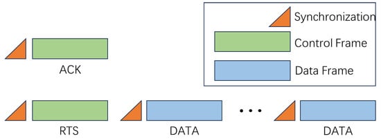 The data packets in the Stop-and-Wait ARQ protocol consist of a Request to Send (RTS) control frame and multiple data frames, while the acknowledgment packet comprises an ACK control frame, as shown in Figure 12.