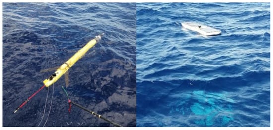 The surface wave-energy glider traversed the water surface by harnessing wave energy, while the underwater glider followed a profiling trajectory underwater at a speed of approximately 1 knot. The maximum diving depth of the underwater glider was limited to 850 m. The equipment deployment for the sea trial experiment is shown in Figure 13.