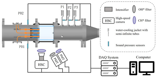 Pressure fluctuations during thermoacoustic instability are captured using a BSWA MPA471S microphone, characterized by a sensitivity of 0.9 mV/Pa, a dynamic range of 170 dB, and an uncertainty of ≤1% FS. These pressure measurements are positioned at 225 mm (P1), 285 mm (P2), and 345 mm (P3) from the injector outlet plane. Semi-infinite tubes are employed for all microphones to detect pressure oscillations. The tube section near the combustion chamber consists of a straight metal tube enclosed by a water-cooling jacket, which maintains a continuous flow of cooling water to keep the sensor within its operational temperature range. The tube’s other end connects to a 20 m closed tube to prevent wave reflections. A KELLER M5HB absolute pressure sensor, with a sensitivity of 3.3 V/bar, a range of 3 bar, and an uncertainty of ≤1% FS, measures pressure fluctuations in the fuel line. Flame HRR fluctuations are quantified via the combined intensity of OH and CH chemiluminescence [29]. The photomultiplier tube (PMT) for OH detection uses a 310 ± 10 nm filter, while another PMT for CH detection employs a 435 ± 5 nm filter. The HAMAMATSU CH253 PMT model, with a sensitivity of 250 μA/lm and an uncertainty of ≤1% FS, is utilized.