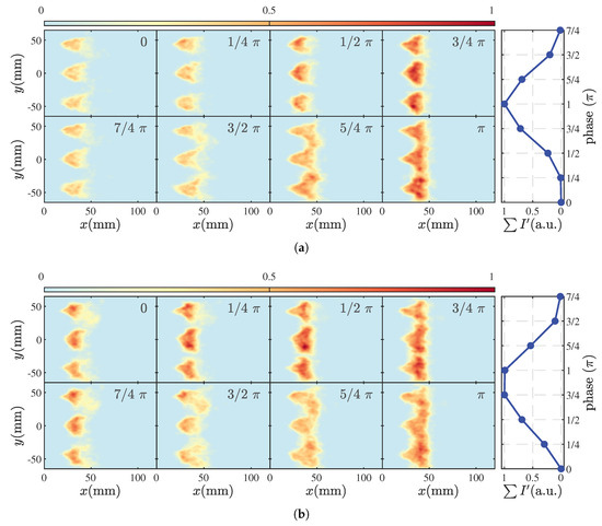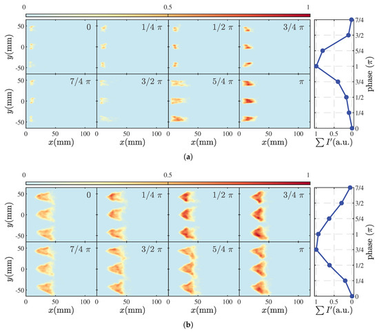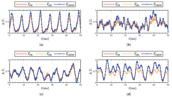 Under various equivalence ratios, the normalized global CH chemiluminescence intensity (), global OH chemiluminescence intensity (), and spatially integrated CH chemiluminescence images () show consistent phase and similar amplitudes at different times. This suggests that CH chemiluminescence images can accurately represent the spatial distribution and fluctuation characteristics of flame HRR. However, it is worth noting that the use of measurement methods in nonpremixed flames is still a topic of controversy. Since it is beyond the scope of this paper to elucidate the mechanism of CH* generation during the nonpremixed combustion of hydrocarbon fuels, we mainly used the CH* signal as an indicator in this study to visualize the fluctuating trend of heat release rate. It is important to emphasize that while CH* signals were taken into account in our analysis, they were not the main focus of our investigation.