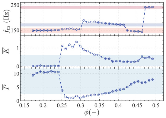 The stability map of the combustion chamber: (top), (middle), and (bottom) variation with equivalence ratio; the solid circles represent unstable conditions; the hollow circles represent stable conditions; and the shaded area indicates the range of critical and values.