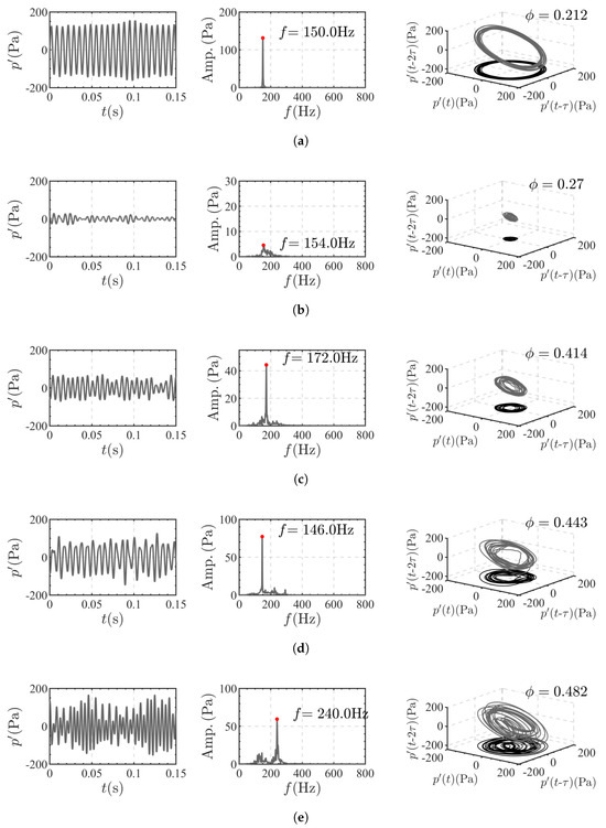 The pressure signal (left), frequency spectrum (middle), and phase space reconstruction (right) vary with : (a) = 0.212 (M1). (b) = 0.27 (MS). (c) = 0.443 (M2). (d) = 0.482 (M3). (e) = 0.482 (M3).
