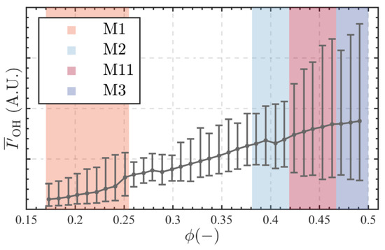 To compare the characteristics of flame HRRs across different thermoacoustic instability modes, we first analyzed the global HRR oscillations at various equivalence ratios. Figure 6 shows the trends of global HRR, represented by OH* fluorescence intensity, as a function of . The data are normalized to the average luminous intensity at . As increases, the rise in combustion power leads to an increase in the average HRR.