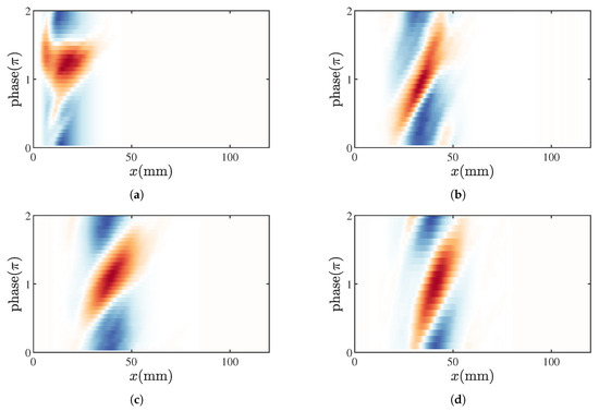 To more intuitively analyze the differences in flame HRR responses under two modes, Figure 11 provides phase-space diagrams [10,42] of the flame HRR for different modes. In these phase-space diagrams, the horizontal axis represents the axial co-ordinate of the flame, while the vertical axis indicates the phase. The contours reflect changes in the flame HRR relative to the time-averaged results. Under the M1 and M11 modes, the phase-space distribution of the flame HRR is essentially identical, with differences only appearing in the flame distribution areas affected by changes in flame shape. Within one cycle, the flame undergoes stretching, separation, and fracture processes. In contrast, the higher instability frequencies in the M2 and M3 states result in more fluctuation bands within a single cycle. The slope of these bands is also significantly steeper than that of the M1 and M11 states. The flame HRR is primarily concentrated at the flame front. In the phase-space results, the slope of the bands satisfies the following:
