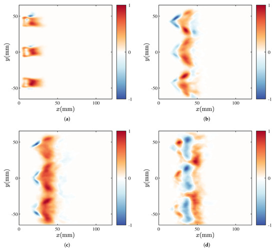 In contrast, the M2 state, shown in Figure 7b, exhibits significant differences in flame morphology compared to the M1 state. Overall, these differences manifest in two aspects: First, with the increase in the equivalence ratio and the addition of more fuel, the airflow velocity at the injector exit increases, causing the flame to transition from an anchored state to a lifted state, and the flame shape changes from elongated to V-shaped. The topological transitions in nonpremixed flames have been extensively detailed in Ref. [39]. Second, from the perspective of flame geometry, there is no significant change in flame length. The flame structure mainly oscillates radially, whereas, in the M1 state, the flame oscillates axially. At , the bottom of the flame has slight wrinkles, forming a tulip shape due to the swirling flames from the three injectors. At , the HRR at the bottom of the flame initially strengthens, with the most noticeable change observed for the middle injector. By , the flame opening angle widens, and the HRR in the wrinkled area further increases. As T increases further, this wrinkle gradually propagates downstream and reaches its maximum value at . With the increase in inlet air velocity, the height of the flame surface wrinkles gradually increases. This mode of flame fluctuation, characterized by expansion and contraction, leads to variations in flame surface area, resulting in the global HRR fluctuations shown in Figure 6. Under the influence of acoustic pressure fluctuations, the central recirculation zone of the swirling flame experiences periodic velocity fluctuations, and periodic sound-induced vortex structures appear in the inner and outer shear layers [40]. Their periodic generation, development, and dissipation are the primary reasons for the significant changes in the HRR.