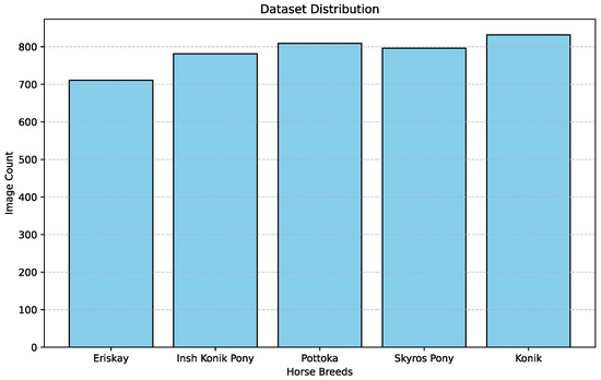 We created an evenly distributed dataset, collecting a similar number of data points from all five aforementioned horse breeds. Figure 1 gives the distribution of image count across the five breeds. There are 711 Eriskay Pony images, 781 Insh Konik images, 809 Pottoka images, 796 Skyros Pony images and 832 Konik images.