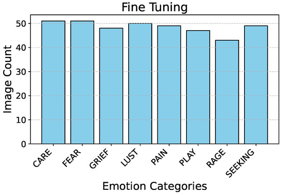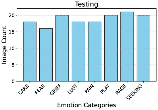 Figure 2 describes the split ratio in the stratified-shuffle split. Figure 3 and Figure 4 describe the emotion distribution in the 10% and 4% splits, respectively. It is important to note that our team classified 14% of the total collected data, amounting to 555 images, into seven Panksepp [9] and the ‘Pain’ emotions manually. Ashley et al. described a comprehensive method of deciphering the ‘Pain’ emotion among equines in [75]. Kieson et al. provide a unambiguous idea of identifying affection and lust among equines in [27,31]. McDonnell et al. describe the playful behavior in horses in [52]. Burke explains in detail the movement patterns associated with exploratory and seeking behaviour among horses in [38]. Fureix et al. give an insight to the display of grief in horses in [57]. Leiner gives a detailed analysis of fear and rage among horses in [76]. Our team has adhered to the directives established by the above research papers while labeling the few hundred images for downstream tasks and testing. It is important to note that labeled data are only required to analyze the performance of the encoder that was trained using unlabeled data.