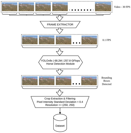 The pipeline starts with a high-frame-rate video at 30 FPS, which is then reduced to 0.1 FPS to prevent redundant frame processing. YOLOv8x [77] detects horses in the frames, using its 68.2M parameters and 257.8 GFLOPs computational power. Each detection is represented as a bounding box around the identified horses within the frames. During crop extraction, only those bounding box regions with low noise and sufficient resolution are maintained for high-quality data. These are meant for use in tasks such as training ML models or for analysis within a domain for the purpose of analyzing horse images.