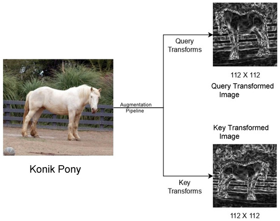The primary function of the augmentation layer is to emphasize the invariant features within an image. This implies that an augmentation layer should be kept flexible, to see which components within the layer perform best. The original MoCo [3] augmentations were borrowed from SimCLR [2], which itself was trained on the ImageNet [80] dataset. Specifically, SimCLR [2] was trained on the ILSVRC-2012 version, which contains over 1.2 million labeled images across 1000 categories. Our dataset contained only 3374 images for training. Learning from [27,31,38,57,75,76], we discovered that a horse’s posture and the relative position of its neck, head, and tail are the most significant indicators of its emotions. As a result, we developed an augmentation layer with serially organized components that are designed to accentuate these features within a horse image. At the same time, we made sure that our augmentations got rid of any irrelevant features, like the horse’s color and the surrounding terrain. Consequently, we independently developed the query transforms and the key transforms.