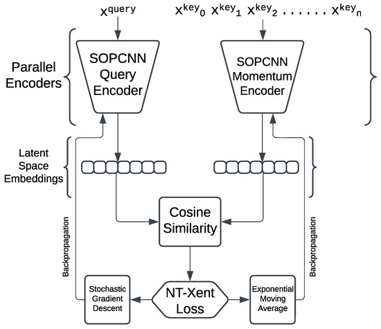 The augmentation layer produces images in a single channel, as it is designed to convert all images to grayscale. As a result the traditional encoders used with MoCo are not the optimal choice here. The MoCo paper discussed experimentation with ResNet-50-w4x, ResNet-50w2x and ResNet-50 as encoders. These encoders are not only resource-intensive but also difficult to train with limited hardware. The most significant issue with using these encoders is that they require a large amount of GPU video memory (VRAM). The primary reason behind this is that these encoders are designed to handle data inputs with 3 channels (RGB). By grayscaling our inputs, we not only got rid of the irrelevant color data but also made it easy to train with limited VRAM and computing resources. Consequently, we decided to utilize a completely new encoder architecture, inspired by SOPCNN [81]. With 1,400,000 trainable parameters, MNIST-SOPCNN [82] is ranked 4th in the accuracy rankings for MNIST Image Classification [83], with an accuracy of 99.83%. SOPCNN, standing for Stochastic Optimization Plain Convolutional Neural Networks is an optimization technique that uses a combination of regularization techniques that work together to get better performance, making plain CNNs less oversensitive to overfitting. Our SOPCNN-inspired encoder is a plain CNN structure dedicated to efficient image classification, based on the tenets of simplicity and efficiency as found in [81]. This model systematically follows the implementation of four convolutional layers characterized by ReLU activations with the use of 3 × 3 kernels and 2 × 2 max-pooling for reducing spatial dimensions while extracting hierarchical features simultaneously. The architectural design ends with a densely connected layer with 2048 neurons followed by dropout regularization with a parameter p = 0.8 to prevent overfitting by randomly disabling neurons in the training process. It is designed for grayscale input and allows images of different sizes, which is consistent with leading performance on datasets like MNIST and SVHN. Thus, it shows the efficiency of conventional CNNs if appropriately enhanced through robust regularization methods like dropout and data augmentation. It is important to note that MoCo [3] uses identical architectures in both query and key encoders.