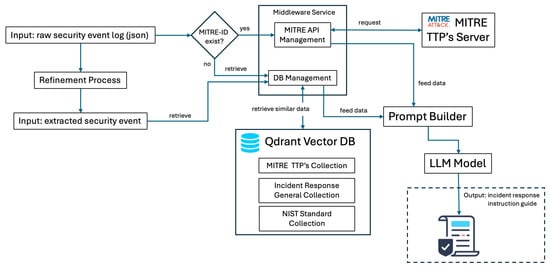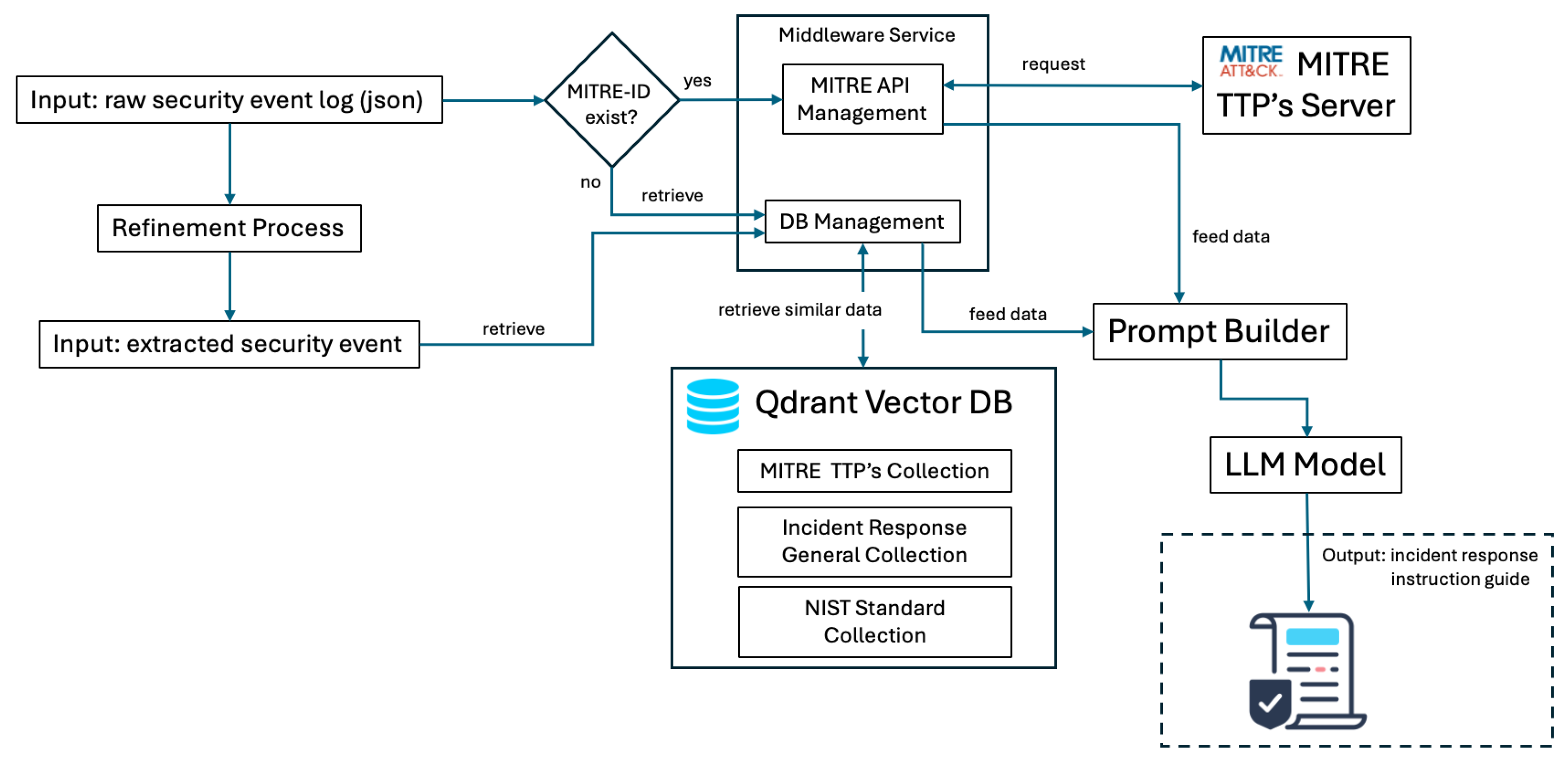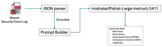 The proposed RAG system integrates advanced components to facilitate efficient data retrieval and processing. It embeds data using the BAAI/bge-large-en-v1.5 model, a sophisticated embedding model optimized for creating high-dimensional vector representations of textual data. For vector storage and similarity search, it employs Qdrant, a robust vector database designed for managing embeddings, leveraging cosine similarity as the metric for identifying semantically relevant matches. The preprocessing pipeline begins with raw event logs in formats like JSON, which are parsed and encoded using a prompting LLM extractor powered by the Pixtral model. This model dynamically extracts and structures critical information based on predefined beneficial criteria, ensuring the extracted data align with retrieval objectives. The parsed information is then encoded into embeddings for efficient storage and retrieval within the vector database, enabling seamless integration of retrieval-augmented workflows in downstream applications.