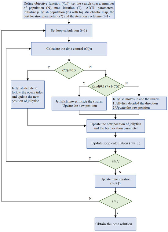 Jellyfish Search is a new optimization method suggested by Chou et al. in 2021 [43]. This approach emulates the foraging behavior of jellyfish in the ocean and incorporates both exploration and development processes to establish an effective model for optimization algorithms. The specific methodology is outlined as follows: