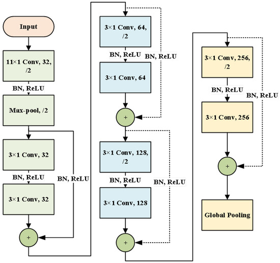 The network structure used is shown in Figure 3, including an initial convolution pooling layer and four residual learning layers, and enabled following the global pooling layer and classifier module for classification. Taking the initial convolution as an example, the parameters are described. The following Table 1 shows the network parameters. Moreover, a zero-filling scheme is run in all the convolution layers of the designed residual network. The filling size assigned to the initial convolution is 5, and the other filling sizes are 1. After multiple residual blocks, global pooling is designed to process the learned invariant attributes, which treats each feature graph as a region to perform pooling operations, and its output size is equal to the feature graph numbers. The neuron numbers in the classification layer are assigned to the identical number as the number of healthy classes.