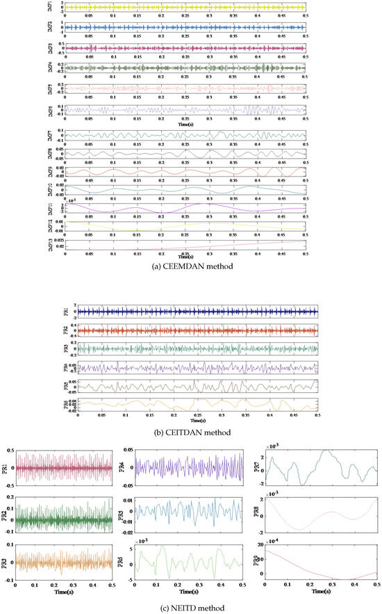 Figure 5 shows the decomposition results obtained by the three signal decomposition methods. The signal is disintegrated into 13 modal constituents by CEEMDAN, which is far more than the number of model components decomposed by NEITD and CEITDAN. Moreover, modal aliasing occurs in IMF 5 and IMF 6 when using CEEMDAN, while NEITD can efficiently resolve the issue.