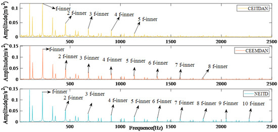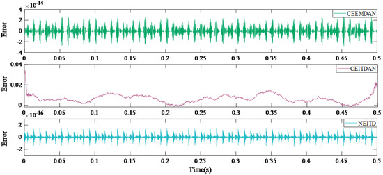 The results of the reconstruction errors for different methods are presented in Figure 6. When compared to alternative algorithms, the proposed algorithm exhibits the lowest reconstruction error, measuring only . Figure 7 illustrates the envelope spectrum transformation results obtained using various methods. Although the CEITDAN approach is capable of deriving fault characteristic frequencies, there exists an issue with incomplete signal noise filtering. The CEEMDAN method reduces noise interference and improves the signal-to-noise ratio; however, beyond 1500 Hz, both fault information and noise are decomposed and filtered together due to weak fault signals being present. On the other hand, the proposed algorithm reduces noise interference while retaining fault characteristic information after 1500 Hz successfully. This paper verifies the proposed algorithm’s efficacy and superiority through objective quantitative indices as well as subjective characteristic frequency extraction.