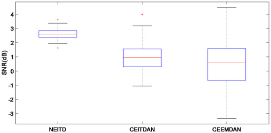The outcomes attained by employing the proposed algorithm and the approach at various SNR levels are summarized in Figure 8 using box plots. The suggested approach exhibits the biggest average SNR and minimal fluctuations. The box plots demonstrate the superior performance of the NEITD method compared to other approaches, thereby highlighting that utilizing estimated signal noise as auxiliary noise can significantly enhance the output signal’s SNR.