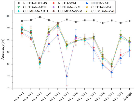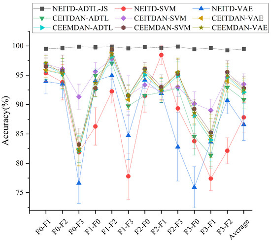 The presented results show the proposed algorithm’s leading performance in varied transfer tasks, thereby providing a highly effective classification capability. When compared to alternative techniques, the proposed algorithm consistently outperforms them and emphasizes the significance of domain adaptation for practical diagnostic applications. While certain methods like CEEMD-SVM achieve high average accuracy (e.g., 99.31% in tasks F1-F2), their performance exhibits significant variability across different tasks. Conversely, NEITD-ADTL-JS consistently delivers robust outcomes across diverse transfer tasks, as evidenced by an average accuracy of 99.50% shown in Figure 9, thus highlighting the suggested approach’s efficiency and superiority.