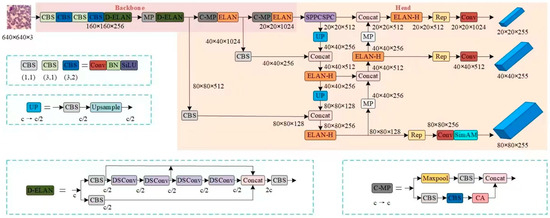 YOLOv7 is a high-performance deep learning model for object detection. In tests conducted on the COCO public dataset, this model demonstrated superior detection accuracy and speed. The network structure of YOLOv7 comprises three components: Input, Backbone, and Head. Initially, the input section scales the image size to 640 × 640 × 3, which is then sent to the feature extraction network. This network includes several CBS modules, ELAN modules, and MP modules. In the prediction phase, feature maps of large, medium, and small scales are obtained through multi-scale feature fusion facilitated by the FPN (Feature Pyramid Network) and PAN (Path Aggregation Network) structures. These feature maps are subsequently sent to the detection head to generate three-scale prediction results. The final detection results are obtained through non-maximum suppression processing. The network structure of YOLOv7 is depicted in Figure 3.