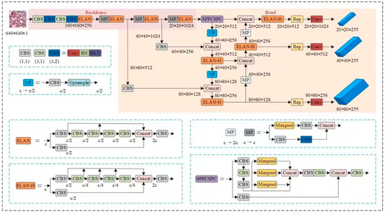 The Fluorescence Photometry Method (FPM) was employed to gather data on blood cells. Through meticulous data processing, a comprehensive dataset was derived, and the blood cell dataset was subsequently constructed. Utilizing the experimental platform of the FPM system, low-resolution images of three RGB channels of blood cells were collected. These images were then reconstructed to yield high-resolution images with a broad field of view. Prior to training, four enhancement strategies were applied to the blood cell image data to enhance the model’s generalization and robustness. Following this, the refined YOLOv7 network was utilized for blood cell detection. The structure of the improved YOLOv7 network is depicted in Figure 2.