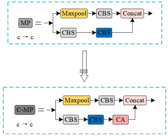 Specifically, the coordinate attention mechanism (CA) is fused in the MP structure, and the output feature map is passed to the CA attention mechanism after 3 × 3 convolution. This fusion enables the network layer to simultaneously learn rich channel and spatial attention weights, effectively retaining complex feature information. It not only improves the model’s ability to locate overlapping cells but also can extract the key feature information of the image more accurately in the feature extraction stage. Since the CA module requires a certain amount of computational overhead, in order to save computational costs, this chapter only adds C-MP modules at key locations in the backbone network. This not only ensures the efficiency of the model on the blood cell data set but also improves the detection accuracy. The C-MP module structure is shown in Figure 5.
