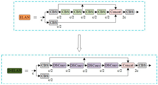 When analyzing the model, it is noted that although the improved C-MP module effectively improves the accuracy and recall rate of the model, there are also problems with increasing the number of parameters and increasing the complexity of the model. In order to balance the accuracy and model complexity, distributed shift convolution (DSConv) is introduced to further optimize the model structure. Through the analysis of the standard convolution, the ELAN module is improved, and the D-ELAN structure is proposed, as shown in Figure 6. The D-ELAN structure improves the convolution kernel from the second layer to the fifth layer to DSConv so as to improve the model detection speed and reduce the number of parameters. This improvement makes the SCD-YOLOv7 model more efficient and lightweight while maintaining high performance and is suitable for complex tasks such as blood cell image detection.