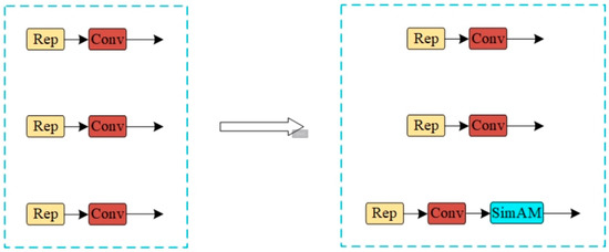 The SIMAM module is a streamlined attention mechanism. Unlike existing channel and spatial attention mechanisms, it can learn attention across both channels and spaces, thereby capturing key information in the feature map with greater flexibility. As a non-parametric 3D attention module, SIMAM diverges from 1D and 2D attention mechanisms that solely focus on the importance of channels or spaces. It can concurrently emphasize the importance of each channel and spatial location feature, inferring the three-dimensional attention weight through an in-depth analysis of feature mapping. In visual tasks, this mechanism assigns weights to neurons based on their importance, thereby directing more attention to information-rich neurons and significantly enhancing the model’s feature extraction capability. The structure of the SIMAM attention mechanism is depicted in Figure 8. The module not only takes into account the correlation between space and channel dimensions but also does not increase the number of additional parameters, enabling efficient and accurate detection.