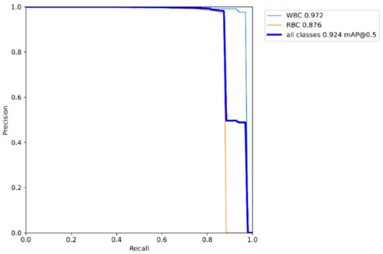 Quantitative results analysis: In order to objectively evaluate the detection performance of the SCDYOLOv7 model on the blood cell image data set, the P-R curve of the model is drawn, as shown in Figure 9. In the P-R curve, the abscissa represents the recall rate, the ordinate represents the accuracy rate, and the mAP@0.5 value of the cell target to be tested is the area enclosed by the curve and the coordinate axis. When the recall rate is close to 1, that is, the model can almost identify all blood cell targets, and the accuracy rate begins to decline rapidly. It fully proves the excellent performance of the SCD-YOLOv7 network in blood cell detection.