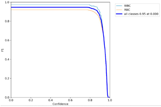F1-scores are a comprehensive parameter to evaluate detector Recall and Precision performance. As shown in Figure 10, it is the F1 score change curve of the algorithm in this paper. The three curves in the figure represent the average F1 score change of white blood cell and red blood cell categories in the data set, respectively. The ordinate is the F1-scores value of each target, and the abscissa is the threshold range.