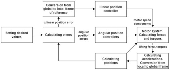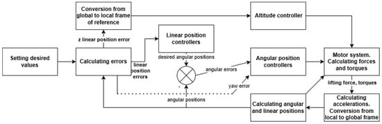 In the conducted research, the system control system of angular positions was used (Figure 2) []. This system consists of four controllers, and each of them is responsible for control of one of four positions: three angles and altitude. This system is the basis for the development of a linear positioning system. The conversion from the global to the local system applies only to the error of the linear position in the Z axis.