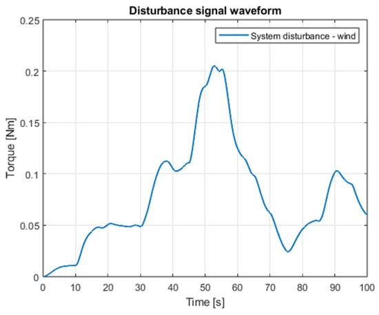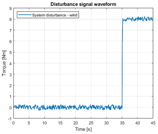 Figure 3 shows the waveform of the proposed external interference signal. The results of the simulation for the case of both angular position controllers are shown in Figure 4, Figure 5, Figure 6 and Figure 7, which present angular position signals and set signals. The presented results indicate that the use of sliding mode control algorithms in the case of controlling an object affected by strong external disturbances allows for reduction in the impact of these disturbances to a significant extent; overshoots caused by the applied external torque were limited. Detailed data and their analysis are presented in Section 9.