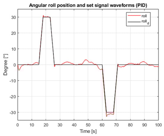 Waveforms of the angular position of the roll and the setpoint value (PID, interference gain: 1, measurement delay: 0.001 s).