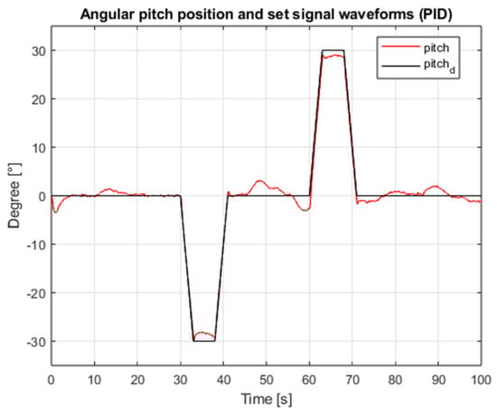 Waveforms of pitch angular position and setpoint (PID, interference gain: 1, measurement delay: 0.001 s).