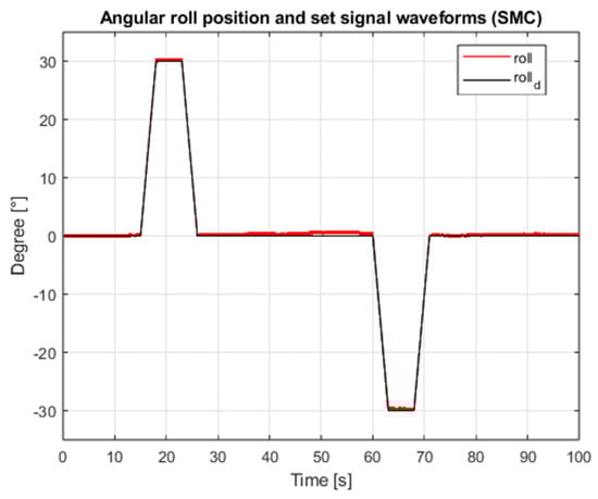 Waveforms of the angular position of the roll and the setpoint value (SMC, interference gain: 1, measurement delay: 0.001 s).