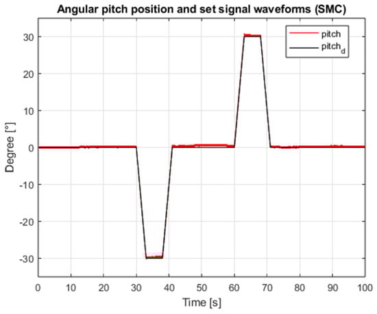Waveforms of pitch angular position and setpoint (SMC, interference gain: 1, measurement delay: 0.001 s).